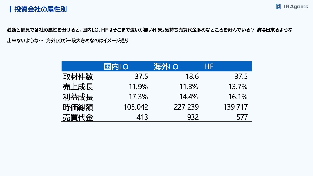 関本:続いて、「国内ロングオンリーがよい」「海外ロングオンリーがよい」「ヘッジファンドは嫌だ」というような話です。今回、独断と偏見で各社の属性を分けてみましたが、時価総額の中央値や売買代金の状況は、国内ロングオンリーとヘッジファンドではあまり違いはありません。ヘッジファンドのほうが、気持ち売買代金が高いほうを期待すると思っています。一方で、海外ロングオンリーがかなり目立っており、想定する時価総額が高そうだということを今回感じました。会社のフェーズによっては「『海外ロングオンリーに買ってほしい』というのは、ハードルが高いのではないか」と話しています。