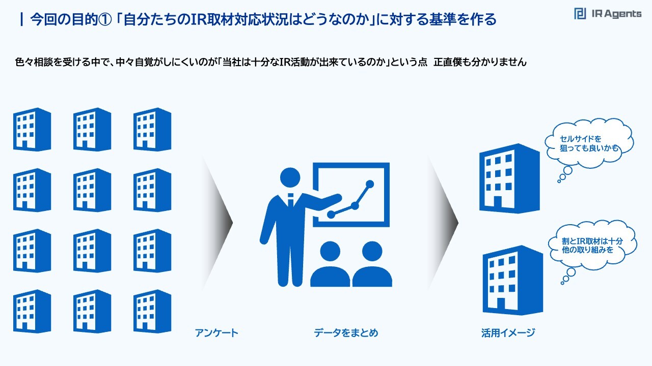 関本:具体的には2つあります。1つ目は「自分たちのIR取材対応状況はどうなのか」という疑問に対する基準を作ることです。IR取材やIR支援を行っている中で「自分たちのIR取材の件数が十分なのかわからない」という疑問や、「もっと取材対応したいが、どうすればいいかわからない」というご相談をいただくことが多いです。私もクリアな回答を持っておらず、感覚的に「御社の取材件数は十分な気がします」「もうちょっとできる気がします」などとお伝えしています。しかし、本当はたくさんのデータを取って統計を得るべきことだと思っています。今回の目的①「自分たちのIR取材対応状況はどうなのか」に対する基準を作る