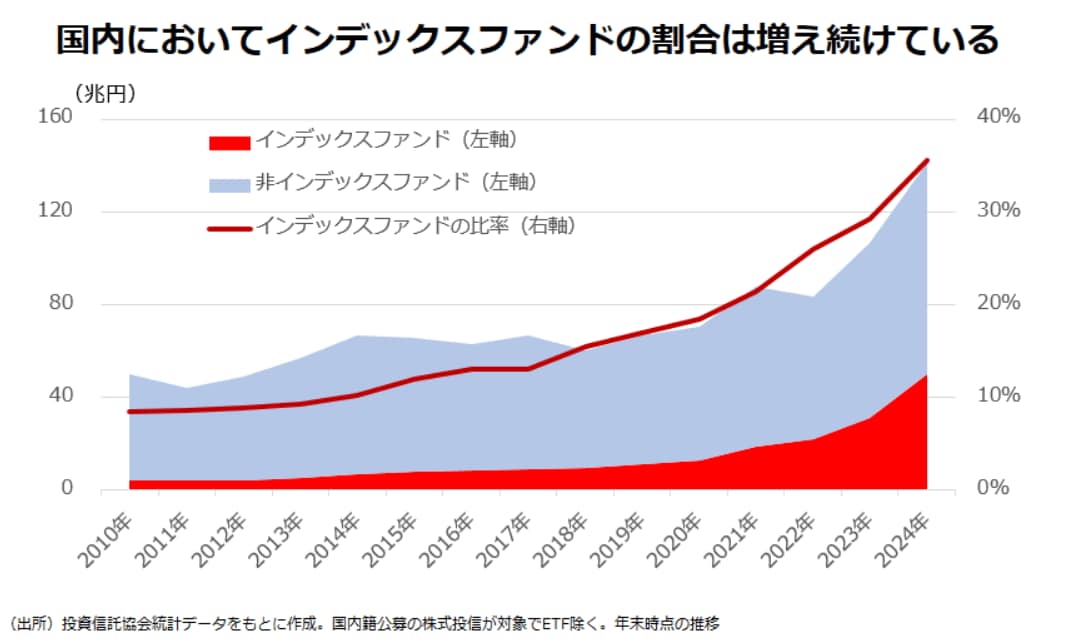 もっとも、「株式市場そのものの形に乗っかるのが最も合理的」であるのは、市場参加者がすべてアクティブ投資家で、あらゆる叡智が市場に結集するような状況を想定しているといえよう。しかし、近年のインデックスファンド偏重の流れによって、「自分で考えずに人のふんどしで相撲をとる投資家」が増えてしまっているのも事実だ。