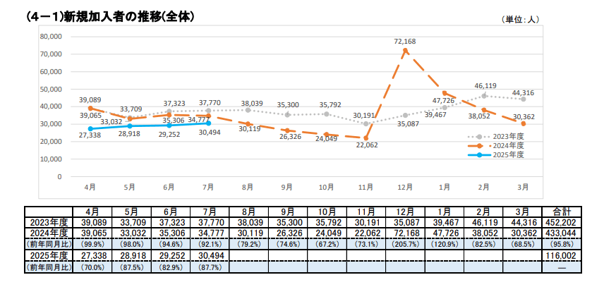 iDeCo(イデコ、個人型確定拠出年金)の最新概況が2025年9月1日に国民年金基金連合会より発表され、2025年7月の新規加入者数は3万494人(前年同月比87.7%)、加入者総数は370万9725人(同109.1%)となった。