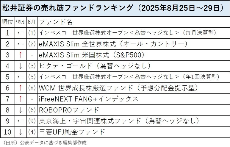 松井証券の投信売れ筋ランキングの2025年8月のトップ2は6月と同様に「インベスコ 世界厳選株式オープン<為替ヘッジなし>(毎月決算型)」(愛称:世界のベスト)、「eMAXIS Slim 全世界株式(オール・カントリー)」(愛称:オルカン)だった。第3位にはトップ10圏外から「eMAXIS Slim米国株式(S&P500)」がジャンプアップしてランクイン。第3位だった「ピクテ・ゴールド(為替ヘッジなし)」は第4位に後退し、第4位だった「三菱UFJ純金ファンド」は第10位にまで下がった。6月に第6位だった「ROBOPROファンド」は第8位に後退したものの、第8位だった「WCM世界成長株厳選ファンド(予想分配金提示型)」は第6位に上昇し、「東京海上・宇宙関連株式ファンド(為替ヘッジなし)」は第9位にとどまった。