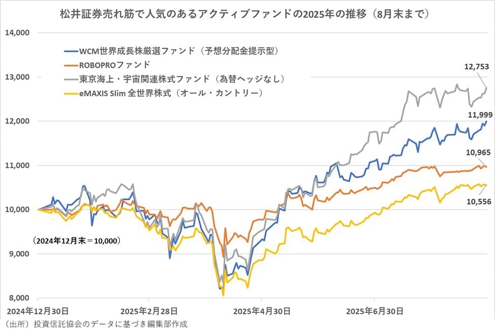 これら新しいファンドのパフォーマンスは、2025年になって「eMAXIS Slim 米国株式(S&P500)」よりも高い成績を残している「オルカン」を、いずれも上回っている。年初来の基準価額(分配金込み)の上昇率は、「東京海上・宇宙関連株式ファンド」が最も高く27.53%、「WCM 世界成長株厳選ファンド」は19.99%、バランス型の「ROBOPROファンド」も9.65%だ。「オルカン」の5.56%をいずれも大きく上回っている。この成績の差が定着するものであれば、これら新しいファンドの評価は一段と高まるものになっていこう。