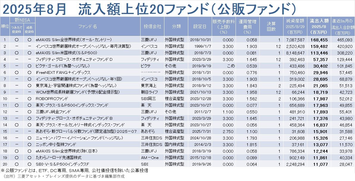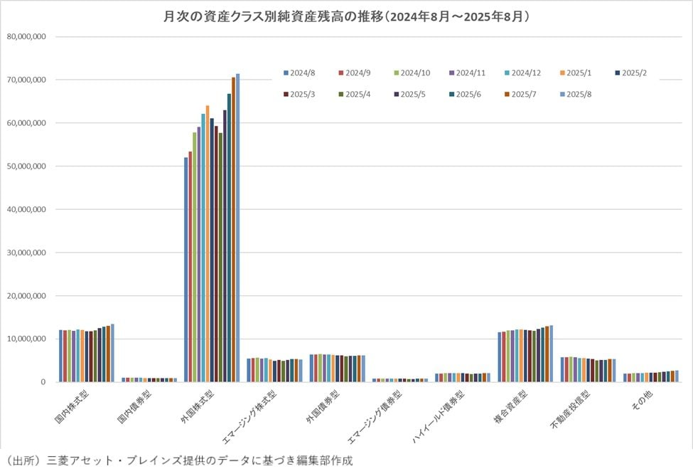 資金流入額は約6690億円と前月の約2070億円から大幅に増額した。資金流入額は1月の約2兆円をピークに6カ月連続で減額していたが7カ月ぶりに増額した。そして、21カ月連続の資金流入超になった。資産別では「外国株式型」(約7150億円)、「複合資産型」(約940億円)の順に資金を集めた。8月は、米「S&P500」、国内の「日経平均株価」も史上最高値を更新する株高局面だったが、「国内株式型」は資金流出になった。三菱アセット・ブレインズは、株価上昇局面での資金流出入額の動向に差が生じた要因として、「国内株式型ファンドの方が短期的な売買を志向する投資家層の割合が大きいことや、安定的な資金流入源である積立投資の規模が外国株式型に比べて小さいことが考えられる」と分析している。