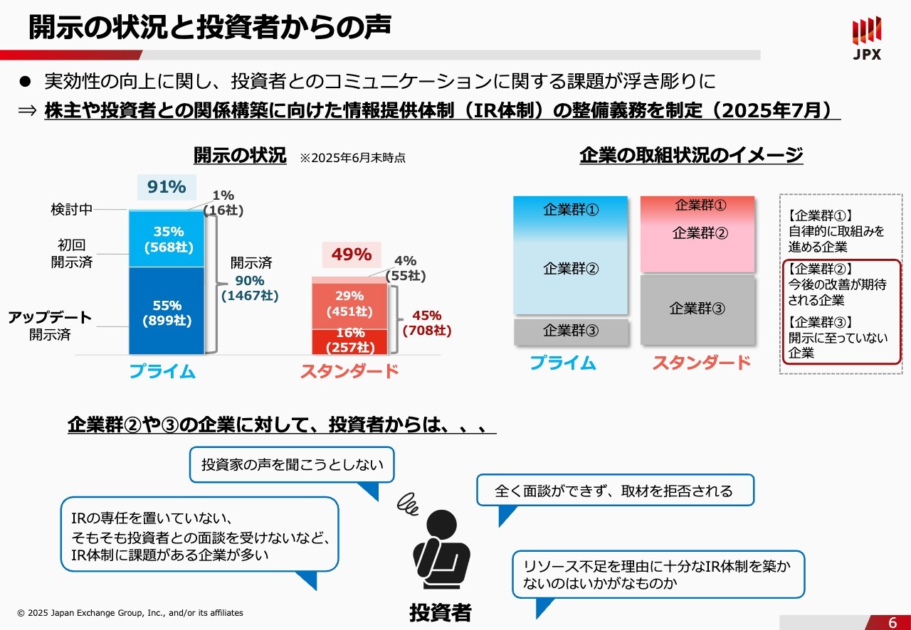 石川:スライド5ページに記載したとおり、年1回以上、進捗状況に関する分析を行って、開示をアップデートするようにお願いしています。スタンダード市場ではアップデートしていただいている会社はまだ少ないですが、プライム市場では半数以上の会社に対応いただいており、だんだんと定着してきている状況です。ただし、投資家の方からのご意見はいまだ厳しいものだということを、スライド6ページ右側の図が示しています。こちらは企業の取組状況のイメージを図示したものですが、自律的に取組みを進める企業群①はプライム市場で1割から2割、スタンダード市場では1割程度ではないかと言われています。その他の多くの企業が企業群②です。開示はしていただいていますが、まだ投資家の目線に届いていない、改善が期待される企業になります。そして、企業群③についてはそもそも開示にも至っていないグループで、②と③が過半数を占めているのが現状です。スライド下段には投資家からの声を記載していますが、厳しい声が届いています。本日は生の声をお伝えするのがテーマですので、そのままご紹介できればと思います。「そもそも投資家の声を聞こうとしていない会社が多い」「全く面談ができずに、取材を拒否される」といった不満が届いています。また、「IRの専任を置いていない」「IR体制に問題がある会社が多い」という声もあります。さらに「リソース不足を理由に十分なIR体制を築かないのはいかがなものか」という厳しい声も届いています。
