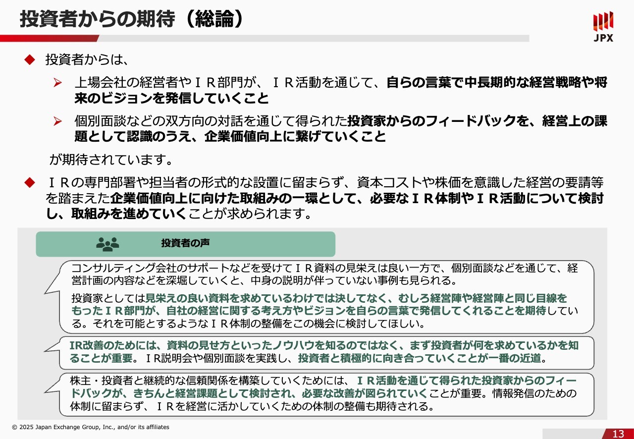 石川:我々も日本取引所グループとして上場している企業ですので、自分たちの首を絞めるようなかたちの内容ですが、あらためて、今回の「IR体制の整備」は最低限の対応であるということをお伝えしたいと思います。投資家の目線はもっと先にあり、十分な情報開示や建設的な対話を行っていただくことで企業価値が向上していきます。繰り返しになりますが、みなさまには前向きに取り組んでいただければと思います。その上で、東京証券取引所も要請して終わりにはもちろんしません。後ほどご紹介するような事例集の提供やIRセミナーの開催等を行い、企業と一緒に伴走する姿勢でみなさまをサポートできればと思っていますのでよろしくお願いします。投資者からの期待(総論)
