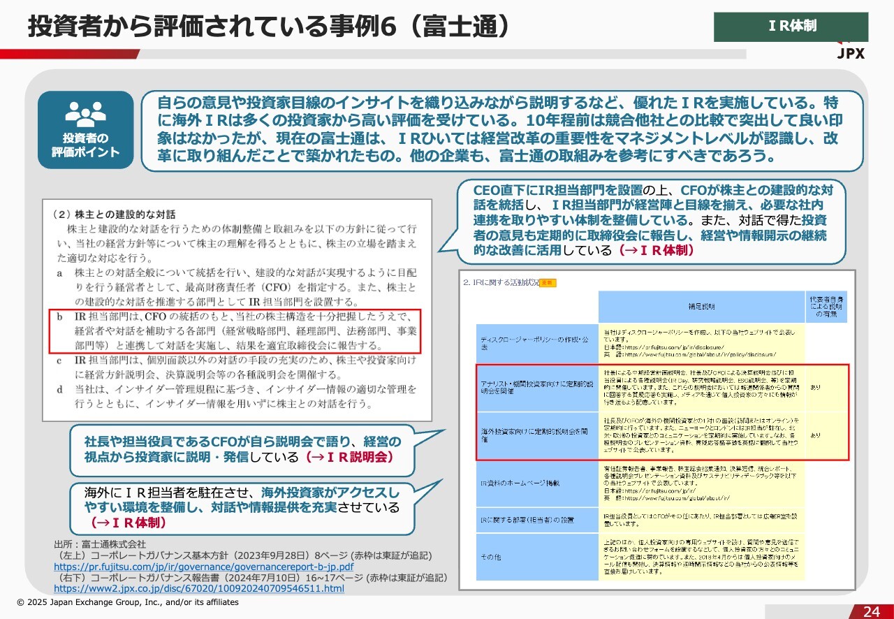 石川:続いて、パイロットコーポレーションの事例です。こちらの事例は非常におもしろく、「従前はIRにあまり注力していなかったようだが、この2年ほどでIRの専門部署を設けて体制を見直した結果、IRが良くなった」というようなコメントが届いています。さらに「投資者と積極的に向き合う姿勢は、他の企業にも非常に参考になる」とまで、投資家に言わせています。やはり投資家は見ているのだということを、あらためて実感した事例です。「事例集に載っているような企業は、最初からピカピカだろう」というようなイメージを持つ方もいると思いますが、この事例のように「前は良くなかったが、良くなった」などと、投資家はしっかりと見ています。ぜひ、みなさまも「常に投資家から見られているのだ」と念頭に置きながら、IRに取り組んでもらえればと思います。また、パイロットコーポレーションも、新たにIRに関する専門部署を設け、IR担当役員を統括責任者とする体制を構築したという点で評価を得ています。投資者から評価されている事例6(富士通)