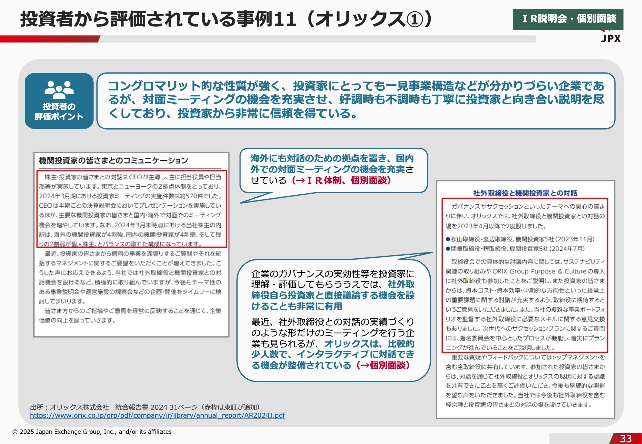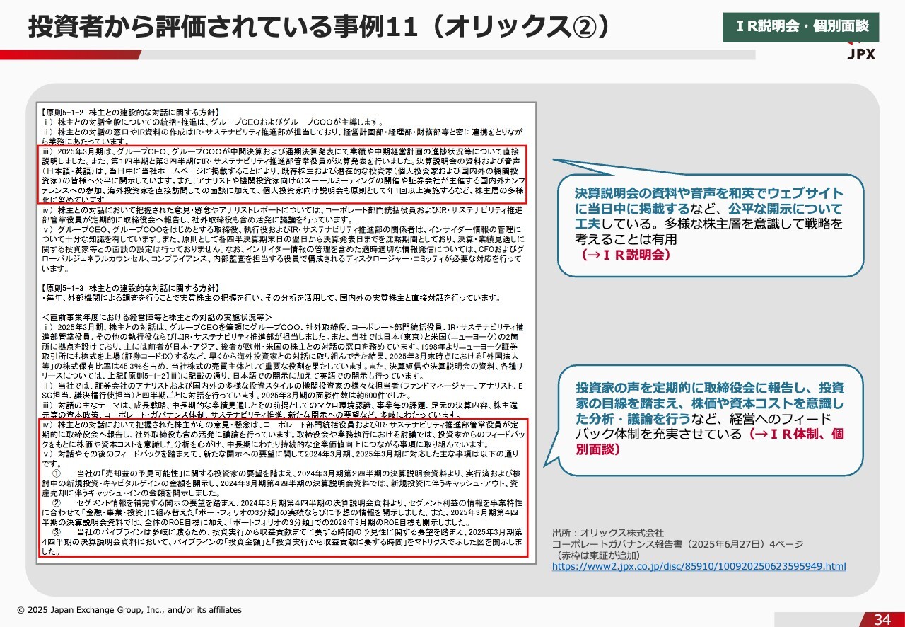 石川:続いて、資生堂の事例です。資生堂の良いところは、株主や投資家から受け取った具体的な要望を踏まえ、それを基に説明会や対話イベントの実施につなげている点です。先ほどから何度もお話ししていますが、投資家が気にするのは、自分たちの要望がしっかりと経営に活かされているかどうかです。それを整理した上で開示している会社というのは、投資家からしても非常に安心感があり、信頼が厚くなっていると思います。投資者から評価されている事例11(オリックス①)