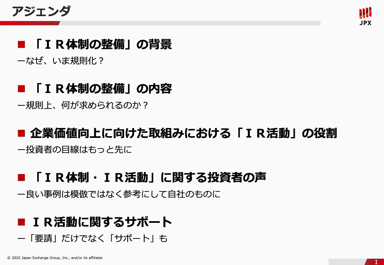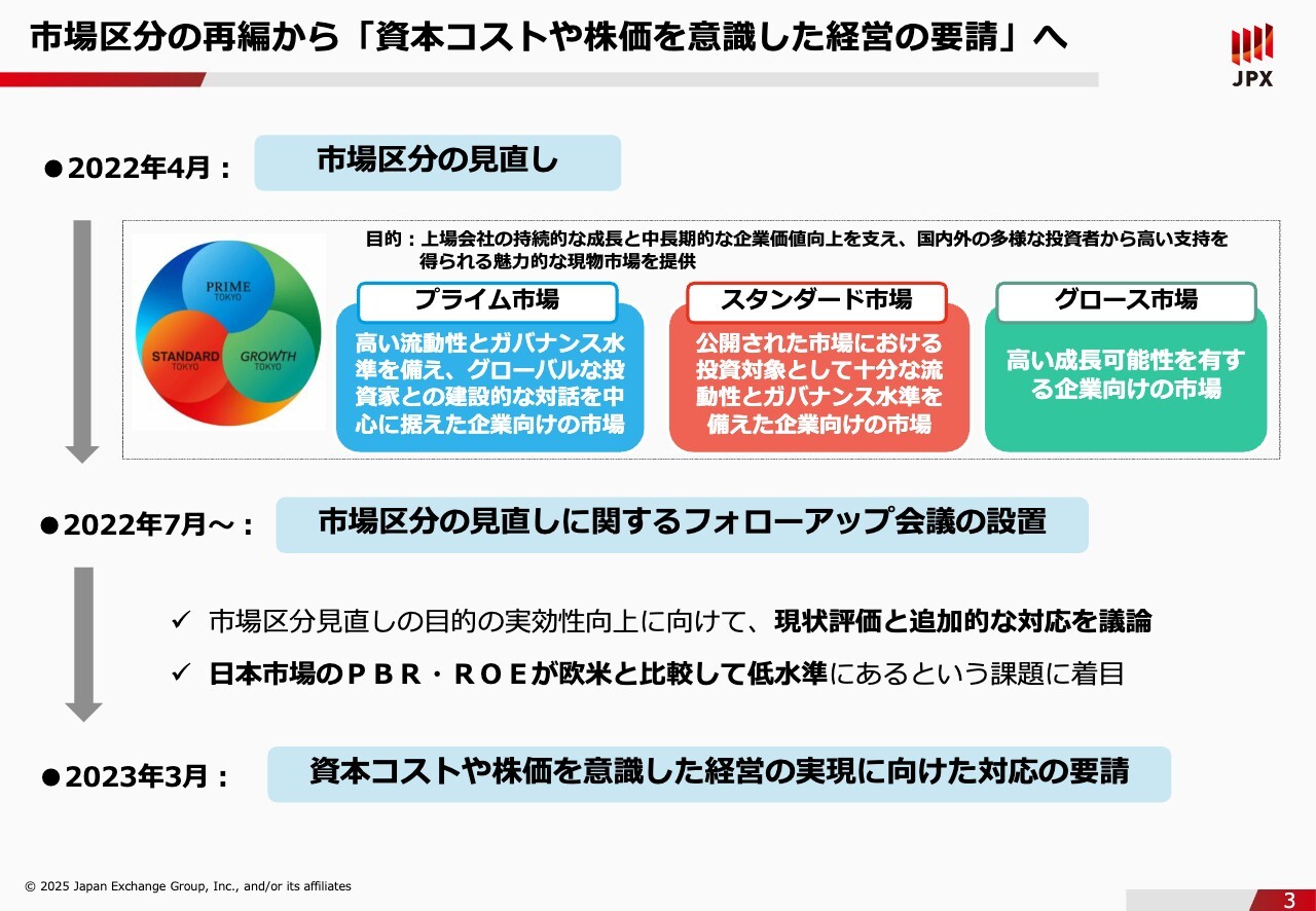 石川:まず、本日の流れを簡単にご説明できればと思います。はじめに「IR体制の整備」の背景についてご説明します。なぜ、いま規則化したのか、みなさまも気になると思いますので、そちらをお話しします。次に、実務担当者の方には規則上いったい何が求められるのかについて細かくご説明します。続いて、規則に抵触しないことも重要なのですが、投資者の目線はもっと先にあるということをお伝えするため、「IR体制・IR活動」に関する投資者の声をお届けしようと思います。良い事例や悪い事例も全部含めてご説明します。最後に、東京証券取引所も「要請」だけではなく「サポート」もしているということをご説明できればと思っています。ここでみなさまにお断りしたいのですが、本日は投資家の生の声を届けることを目的にセミナーを開催していますので、厳しいご意見もいろいろご紹介していきます。上場会社のみなさまからは「東京証券取引所は投資家の声を聞いて、なかなか上場会社の声を聞いてくれない」というお声も届きます。また別の機会で、上場会社のみなさまの不満を投資家の方に届ける活動もしていますので、本日は恐れ入りますが、投資家サイドに回ってご説明します。ご意見・ご指摘などは後ほど真摯に受け止めようと思いますので、よろしくお願いします。市場区分の再編から「資本コストや株価を意識した経営の要請」へ