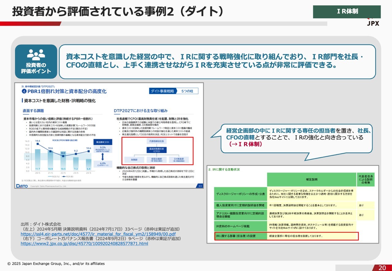 石川:私が一番推したいポイントはこちらなのですが、東亜建設工業の良いところとして、対話で得られたフィードバックを取締役会に定期的に報告していることが挙げられます。きちんと経営層に報告している点が評価されています。先ほどもお伝えしたとおり、投資家のみなさまは自分たちのフィードバックが経営層にしっかり届いているかどうかを気にします。東亜建設工業はそのような体制が整えられていますし、きちんと資料に落とし込んでいるところも、投資家のみなさまの安心感につながっているのではないかと思います。投資者から評価されている事例2(ダイト)