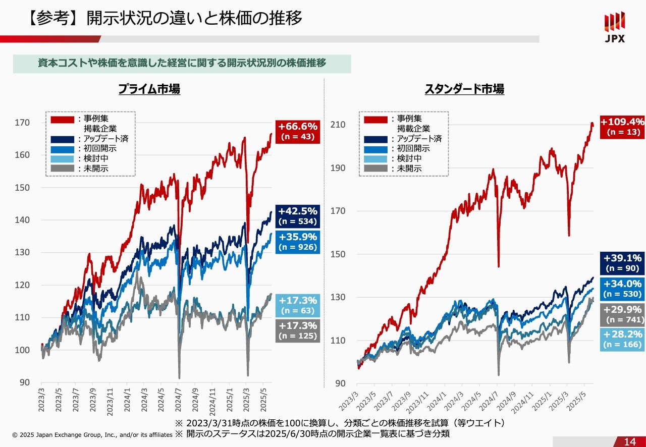 石川:いろいろお伝えしてきましたが、言葉を選ばずに言うと「きれいごと」のように感じた方もいるかと思いますので、開示の積極性が株価に影響を与えているという1つのファクトを提示できればと思います。スライドのグラフは、2023年3月末を100として、上場会社を5つのグループに分類して株価の推移を追ったものです。赤のグループは「この会社は良い」と投資家の方から評価を得られた会社で、事例集に載っている会社群です。紺のグループは要請に応じて開示した上で、さらにその内容を改善し、更新した会社群です。青のグループは初回の開示は行っていますが、まだアップデートはしていない会社群です。水色のグループは検討中、グレーのグループは未開示の会社となっています。ご覧のとおり、プライム市場、スタンダード市場の両方とも、事例集に載っている赤のグループが大きく上昇しているのがわかるかと思います。正直なところ、これは当然だと思います。投資家から「良い」と評価されたということは、投資家と目線が合っているため、将来の期待感のようなものが株価に表れたわけです。一方で注目いただきたいのは、初回開示済みの紺とアップデート済みの青のグループです。投資家からいろいろと厳しいご意見はありますが、それでも検討中の水色や未開示のグレーのグループと比べると、積極的な開示を行ったことでこれだけの差が出ており、最初に見た時は驚きました。したがって、きれいごととは思わずに、このような企業側の姿勢も投資家は見ているということをみなさまもご理解いただいた上で、積極的にIRに取り組んでいただければと思います。