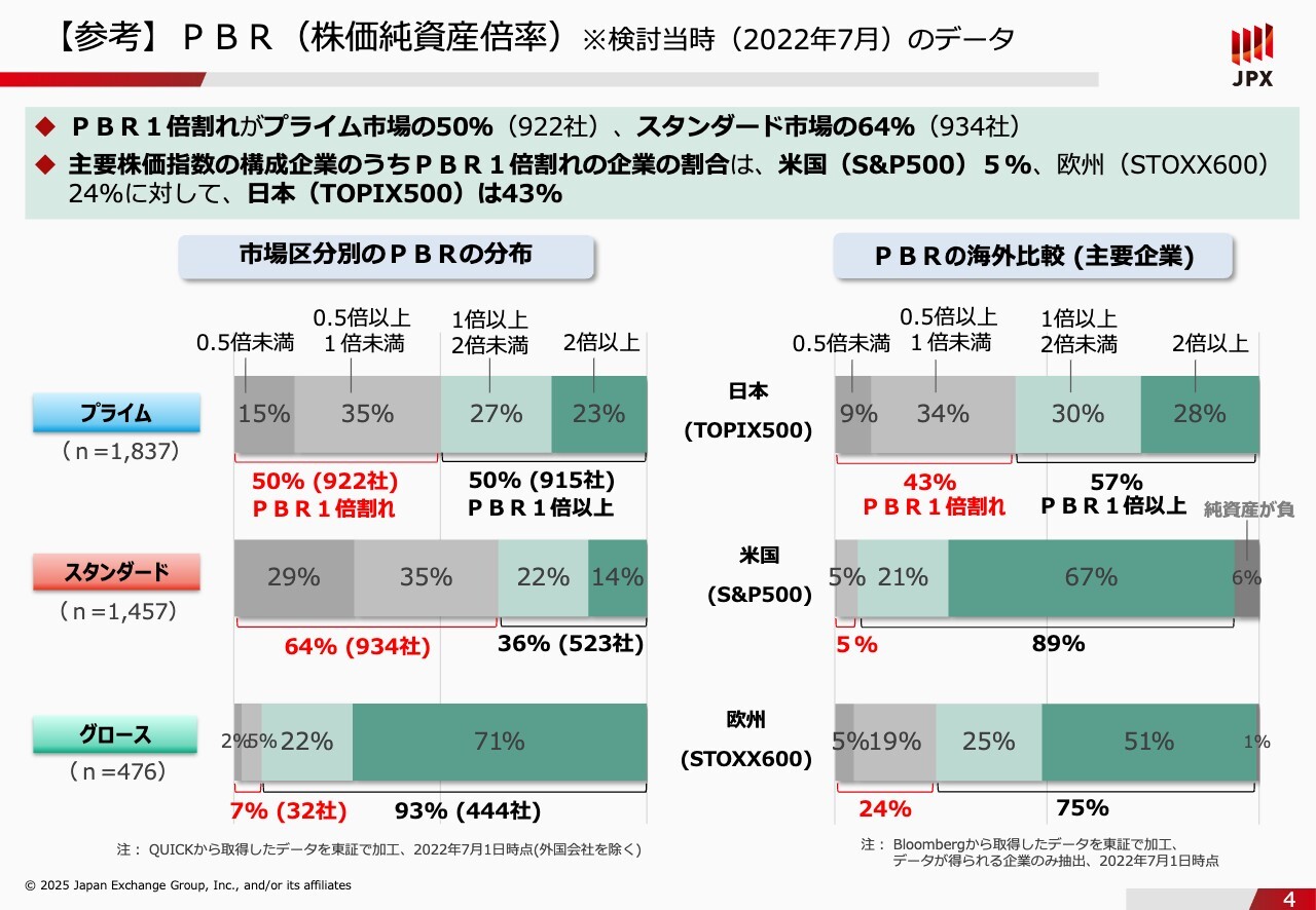 石川:「IR体制の整備」の背景について、なぜ、いま規則化したのかご説明できればと思います。スライドに記載があるとおり、きっかけは「資本コストや株価を意識した経営の要請」からスタートしており、前段が長くなりますが、そこからご説明していきます。まず、2022年4月に東京証券取引所市場区分の見直しをしました。市場が複数あって曖昧でわかりづらいということから、プライム市場、スタンダード市場、グロース市場の3つの市場に再編し、コンセプトを明確化しました。ただし、ここでもみなさまからいろいろなご指摘いただきました。簡単に言ってしまうと、「名前が変わっただけではないか?」「看板を変えただけで実態は変わっていないのではないか?」といったご指摘です。そこで、市場区分見直しの目的の実効性向上に向けて、有識者が集まって話し合っていこうということで、通称「フォローアップ会議」を2022年7月に開設し、いろいろなことを話し合ってきました。【参考】PBR(株価純資産倍率) ※検討当時(2022年7月)のデータ