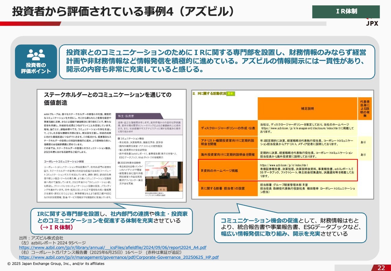 石川:続いて、アズビルの事例です。アズビルについても、IRに関する専門部署を設置し、社内部門の連携および株主・投資家とのコミュニケーションを推進する体制を充実させているという点で、投資家から良い評価を得ています。また、統合報告書や事業報告書、ESGデータブックなど、情報発信でいろいろな手段に取り組んでおり、開示を充実させているところも評価されているポイントです。法定の書類や任意の書類の開示だけでもいろいろありますが、最近はSNSやYouTubeなど情報発信の手段が増えているため、自社にとって何が一番良いかと考えながら、いろいろなリソース、情報発信手段をご選択いただければと思います。