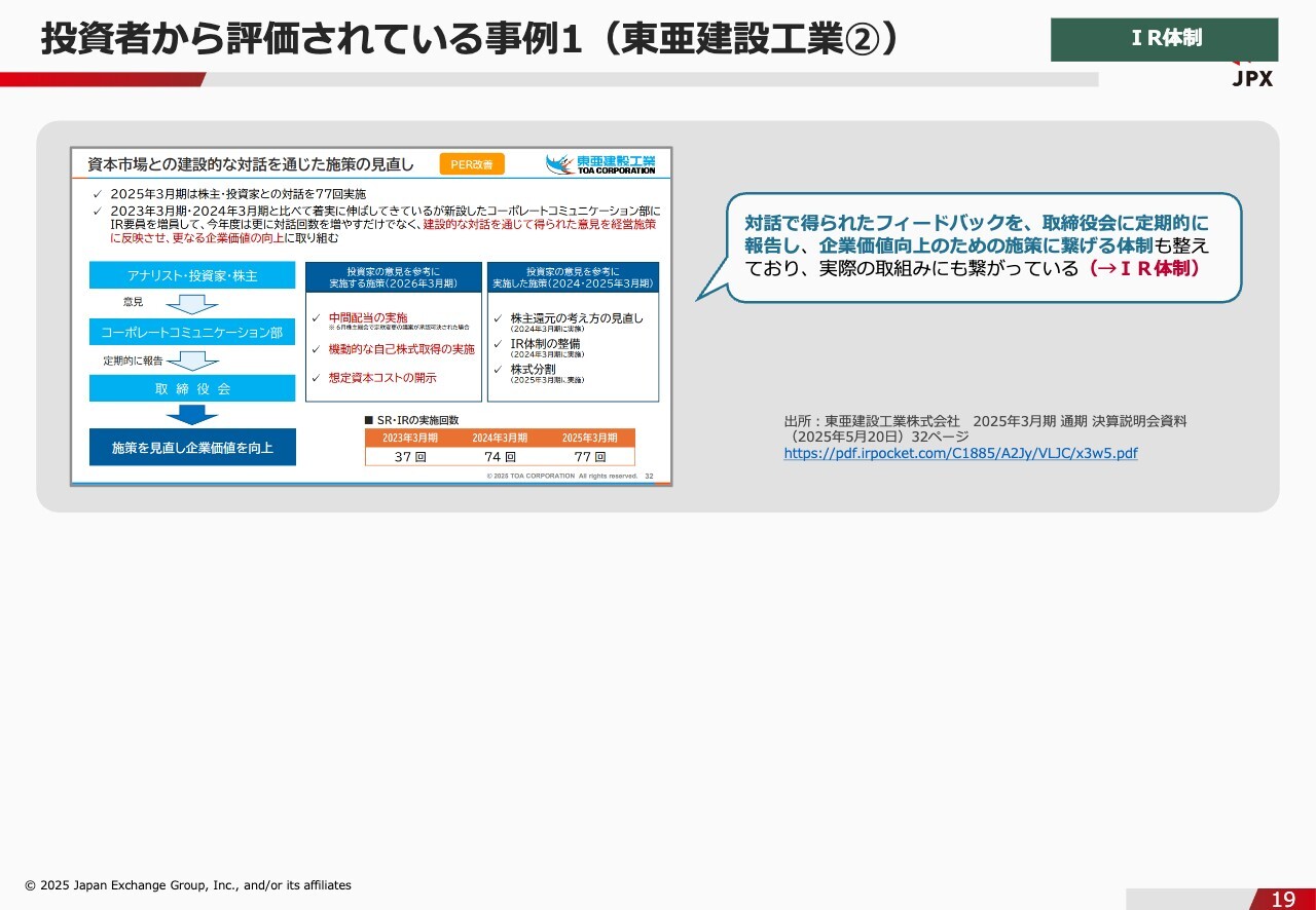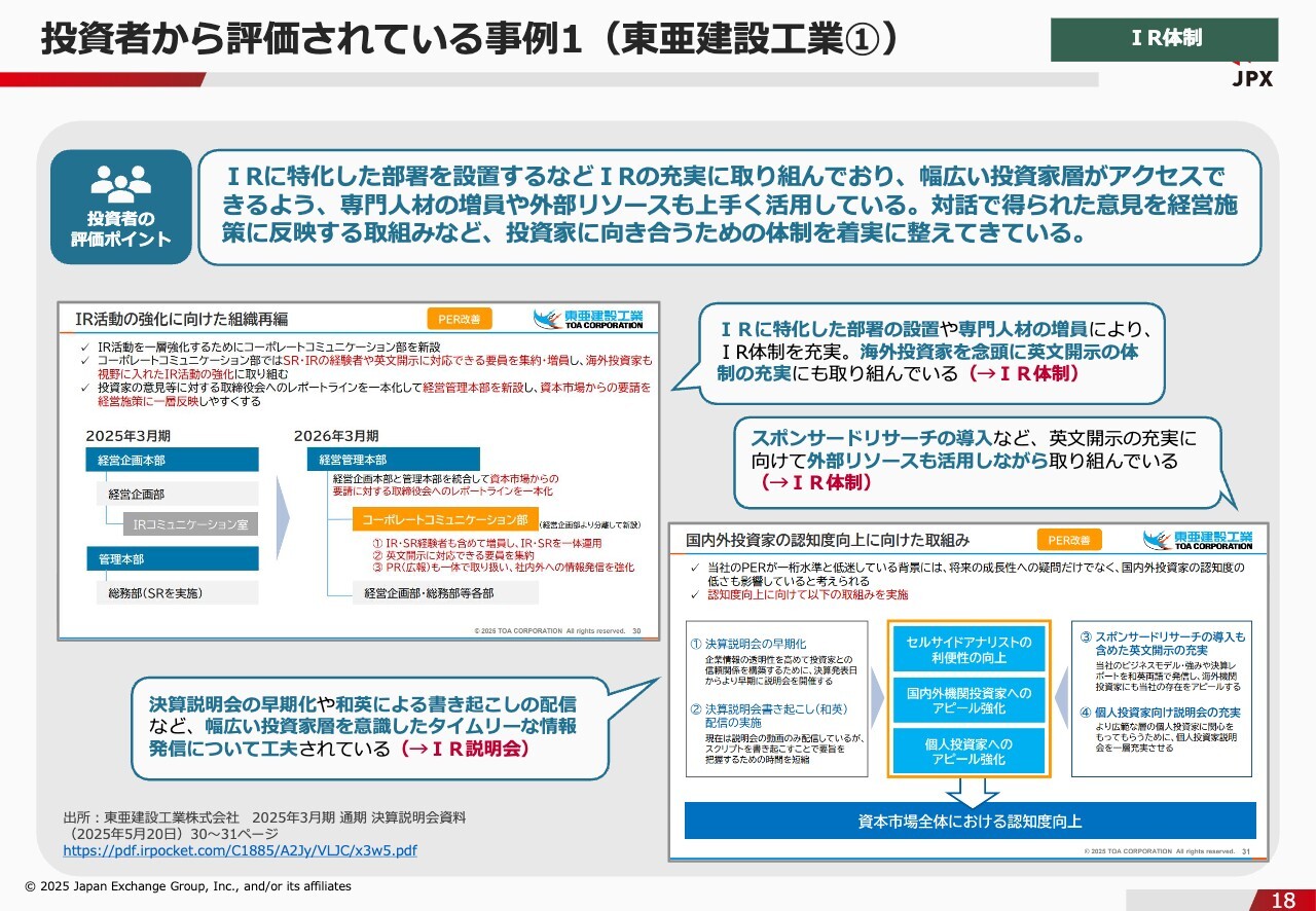 石川:ここからは、IR体制について投資家から評価されている事例をご紹介できればと思います。はじめにお断りしますが、あくまで東京証券取引所が「良い」と言った事例ではなく、100を超える投資家といろいろな面談をして、その声を集約して作ったものになります。1社目は東亜建設工業です。こちらの会社が評価されているポイントは、IRに特化した部署の設置や専門人材の増員によって、IR体制を充実させているところです。そうは言っても、リソースを割くのはなかなか難しいとは思います。やはり人員が限られている会社は多いですし、同様の悩みを多くいただきます。そのような会社に参考にしてほしいのは、東亜建設工業がスポンサードリサーチの導入などによって、外部リソースも活用しながらIRに取り組んでいるということです。リソースを割くのは難しいという会社も、外部リソースを活用していただけたらと思います。また、決算説明会の早期化や、和英による書き起こしの配信など、タイムリーな情報発信について工夫している点も、評価されているポイントの1つです。投資者から評価されている事例1(東亜建設工業②)