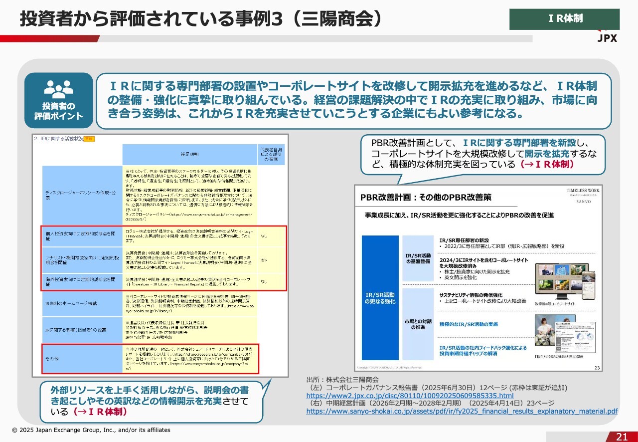 石川:次に、三陽商会の事例です。評価のポイントとしては、PBR改善計画の一環でIRに関する専門部署を新設し、開示を拡充しているという点で非常に評価されています。ここでもやはり、専門部署の設置というのが評価ポイントとなりました。もう1つの評価ポイントは、東亜建設工業と同じく、外部リソースをうまく活用しながら、説明会の書き起こしや英訳などの情報開示を充実させている点です。スライドに記載した資料が小さくて申し訳ありませんが、実はここでログミーFinanceが紹介されています。