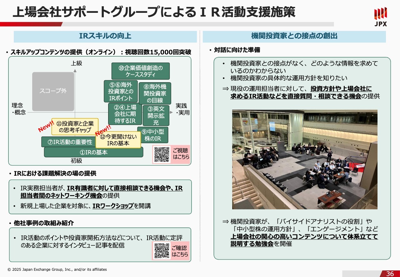 石川:最後に、IR活動に関する東京証券取引所のサポートについてご紹介できればと思います。東京証券取引所も、要請だけではなくしっかりとサポートも行っています。例えば、スライド左側に記載していますが、まずはオンラインセミナー配信です。上場会社の担当者とお話しすると、「どうやって勉強したらいいのかわかりません」というような声をいただきます。上場会社サポートグループでは、「IRの基本」から「海外投資家とのIRのポイント」「海外機関投資家の目線」など、さまざまなスキルアップコンテンツを用意しています。スライドに動画のQRコードを記載しましたので、自社のレベルに合うものを、ぜひご視聴いただければと思います。他にも「1人で対応しており、なかなか相談できる人がいません」「孤独です」といった悩みもよく聞きます。そのような方々に、IR有識者に直接相談できる機会を提供したいと思っています。加えて、IR担当者間のネットワーキング機会やIRワークショップも開講したいと思います。このように対面型の相談会やセミナーを行っていますが、好事例集と同じようなかたちで、「他社事例についても知りたい」という声もいただきます。実は、IR活動に関する賞を受けられるような、IR活動に定評がある会社に対してインタビューを行い、その記事を配信する活動も行っています。現在は4社ほど掲載していますが、順次増やしていく予定です。事例集と合わせて、このインタビュー記事についても、ぜひご確認いただければと思います。また、スライド右側でご紹介しているように、機関投資家との接点を創出するような施策についても取り組んでいます。IR担当者からは、「機関投資家の方とお話をしたことがなく、どんな情報を求めているのかわからない」「足切り基準があると聞いたけど、どういった基準があるのですか?」など悩みを抱えているという声を聞きます。それを解消できる機会を設けようということで、現役の機関投資家を招き、スライドに掲載した写真のように機関投資家を囲むようなかたちで、質問攻めにできる会を用意しています。