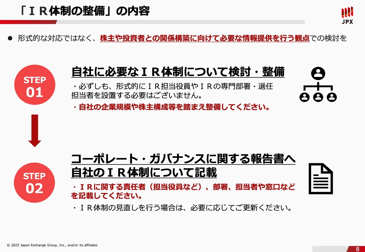 富山:続いて、「IR体制の整備」についてです。必ず対応しないといけないことはわかるのですが、実際にどこまで対応しないといけないのでしょうか? 必須で対応すべきことと、余裕があれば対応することなど、規則の範囲等を一度整理していただきたいです。石川:このようなご質問をよくいただくので、マストでやることと、ベターでやることを整理しながらご説明できればと思います。「IR体制の整備」の規則的な部分をお話しします。企業行動規範の中で明文化されているのですが、スライドには記載がないため口頭で読み上げます。「上場会社は、株主及び投資者との関係構築に向けて必要な情報提供を行うための体制を整備するものとする」かなり抽象的で申し訳ないのですが、ここでは2つのステップに分けてご説明します。1つ目のステップとしては、自社に必要なIR体制について検討・整備していただくことです。2つ目のステップとしては、見直した体制についてコーポレート・ガバナンスに関する報告書に記載していただくことです。必須で求めている内容は、実はこの2点だけです。