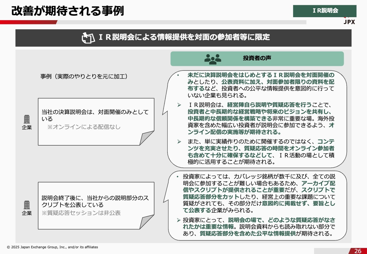 石川:続いて、IR活動について改善が期待される事例と、評価されている事例をご紹介します。まず、改善が期待される事例です。IR説明会による情報提供を、対面の参加者に限定しているというケースです。対面開催のみとして、オンラインによる配信をしていない会社がまだいらっしゃるということです。そのような会社に対して、投資家からは公平な情報提供がされていないという不満の声が上がっているような状況になります。私も機関投資家の方とお話しする機会がよくありますが、やはり投資家には、なるべく多くの会社の説明会に参加したいという思いがあるようです。「オンラインにしてもらうと、いろいろな会社の説明会に参加できるからとても助かっている」という声を聞きます。上場会社のみなさまには、いろいろな投資家に情報を届けるという観点から、オンラインの活用もご検討いただければと思います。スライド下段に記載の事例は、説明会の質疑応答部分のスクリプトをカットしているというケースです。質疑応答の部分が隠されてしまっていることは、情報開示が不公平ではないかというのが投資家からの意見です。説明会の場でどのような質問が出て、どのような議論がされたのかということは、参加していない投資家には非常に重要な情報になります。隠してしまうと「企業として何か言われたくないことを質問されたのではないか?」というような邪推をされることもあります。なるべく質疑応答も含めてスクリプトを公表したほうが、投資家からの評価が高いということです。