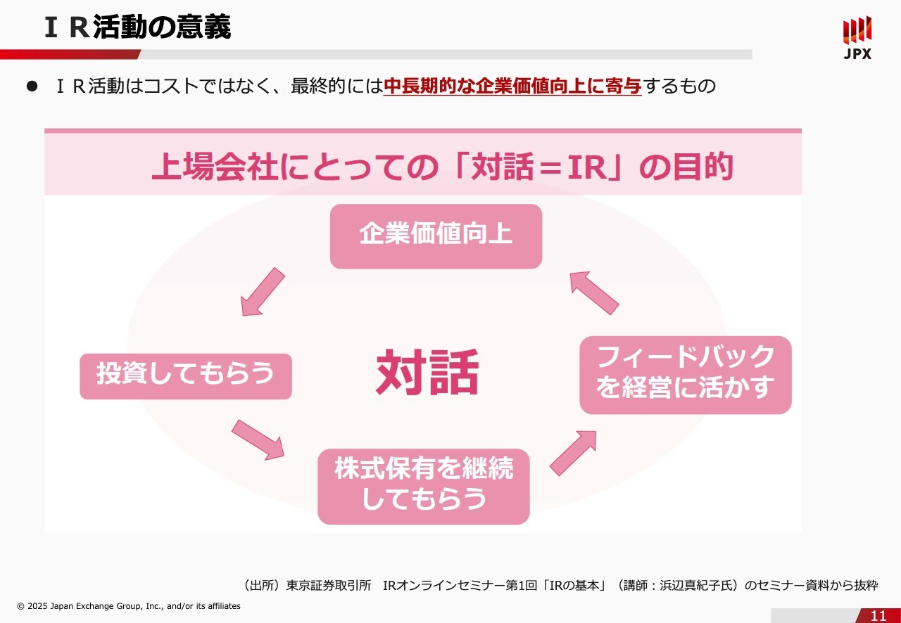 石川:ここからは「自社は規則に抵触しないことがわかったからいいや」と思っていただきたくなくて、設けたパートとなります。規則上求めていることは本当に最低限なのですが、先ほどご紹介したように、投資家の方の目線はもっと上にあるということを、あらためてご説明できればと思います。最近はIRが注目されてきていますが、まだまだ責務と言いますか、やらなければいけないものというネガティブな感覚を持っている会社が多いように私自身も感じています。IRはコストではないということをあらためて伝えたいと思い、こちらのスライドを用意しました。東京証券取引所のIRオンラインセミナー第1回「IRの基本」で、浜辺真紀子氏にご登壇いただいた際の資料です。会社というのは、投資家の方と対話することで投資もしてもらえますし、株式保有も継続していただけます。また、対話する中で会社に対するフィードバックもいただけますので、それを企業価値向上に役立てていただくことで、好循環を回すことができると思います。そのため、上場会社にとってIRは企業価値を向上するものだとポジティブに捉えて、取り組んでいただきたいというのが東京証券取引所としての思いです。富山:こちらのスライドのような資料はよく見るのですが、確かにこの循環は大切だと思います。投資家からのフィードバックを経営に活かすのは重要だと思いますが、IR担当者が経営陣にとって耳障りの悪い内容を報告することは難しいところもあります。そのあたりについて、良い方法はあるのでしょうか? 石川:IR担当者の方ができる努力というのは、限られていると思っています。経営者の方々がIRについて積極的な姿勢や、報告しやすい環境を整えることが最優先であるとは思います。そのうえでIR担当者の方ができることとして、私がIR有識者の方に聞いたお話としては、まずは耳当たりの良いことを報告した後に、「投資家はこのようなことを求めていて、これに取り組めばもっと評価されますよ」と伝える方法があるそうです。小手先のテクニックにはなりますが、最初から悪い面を伝えるよりも、ポジティブなフィードバックを交えながら話すことも有用かと思います。「IR体制の整備」の先へ