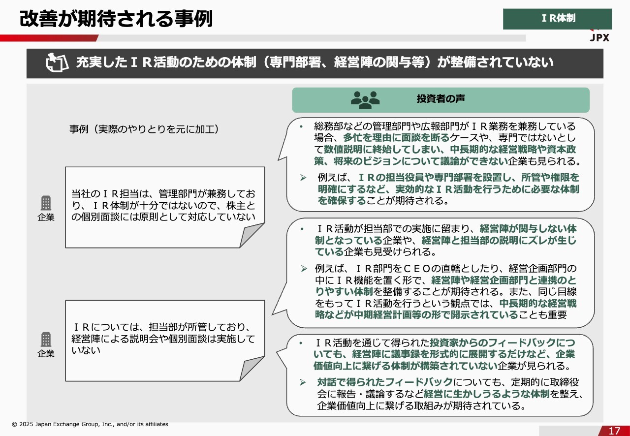 石川:ここからはIR体制とIR活動に関する投資者からの声を具体的にご紹介していきたいと思います。こちらのスライドは、7月に公表した資料です。すでにご覧いただいた方もいるかと思いますが、いろいろと補足しながらご説明できればと思います。まず、IR体制について改善が期待される事例についてです。1つ目は、IR活動のための体制がきちんと整備されていないケースです。スライド左上の事例は「当社のIR担当は、管理部門が兼務しており、IR体制が十分ではないので、株主との個別面談には原則として対応していない」という実際にあった会社とのやりとりを元にご紹介しています。投資家からしてみれば、多忙を理由に面談を断るぐらいなら、十分な体制を整えてほしいわけです。これは別に兼務が悪いと言っているのではなく、兼務だったとしても、会社の中長期的な経営戦略や資本政策、将来のビジョンについて話せる人がしっかりと面談に応じられるような体制を最低限整えていただきたいと思います。また、スライド左下には「IRについては、担当部が所管しており、経営陣による説明会や個別面談は実施していない」という事例もあります。経営陣がIRにあまり積極的でない会社や、経営陣と担当者の方の説明にずれが生じているような会社は、やはり投資家から良い評価を得られず、不満の声が上がっているのが現状です。そのため、みなさまも経営陣と担当者の方との間でしっかり密な連携が取れているかどうか、もう一度よく見直していただいたほうがいいと思います。投資家の方が一番気にするのは、自分たちが挙げた指摘が経営層に届いているのかという点です。そこがしっかりできているかどうかを見直していただくことで、これからのIR体制がより良くなっていくかと思います。中には、先ほどお話があったように、担当者の方が忖度してなかなか経営層に報告できない場合もあります。報告しやすい環境を整えることは経営層の仕事になるかもしれませんが、担当者の方も臆せず、自社のためを思って厳しいご意見はなるべく報告することを意識したほうがいいと思います。