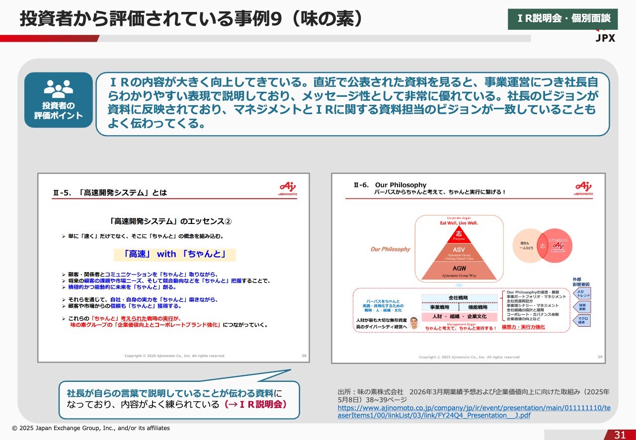 石川:次の事例は、味の素です。スライドの右側に記載していますが、味の素は社長が自らの言葉で説明していることが伝わる資料となっており、非常に良いと評価を受けています。私も投資家の方とお話ししていると、やはり経営トップの言葉を聞きたいという意見をよく聞きます。時価総額が小規模な会社ほど、人に投資をする会社が多いということで、トップの方が説明会に立つというのはもちろんですが、開示資料にそれがわかるように記載されているところが評価されています。