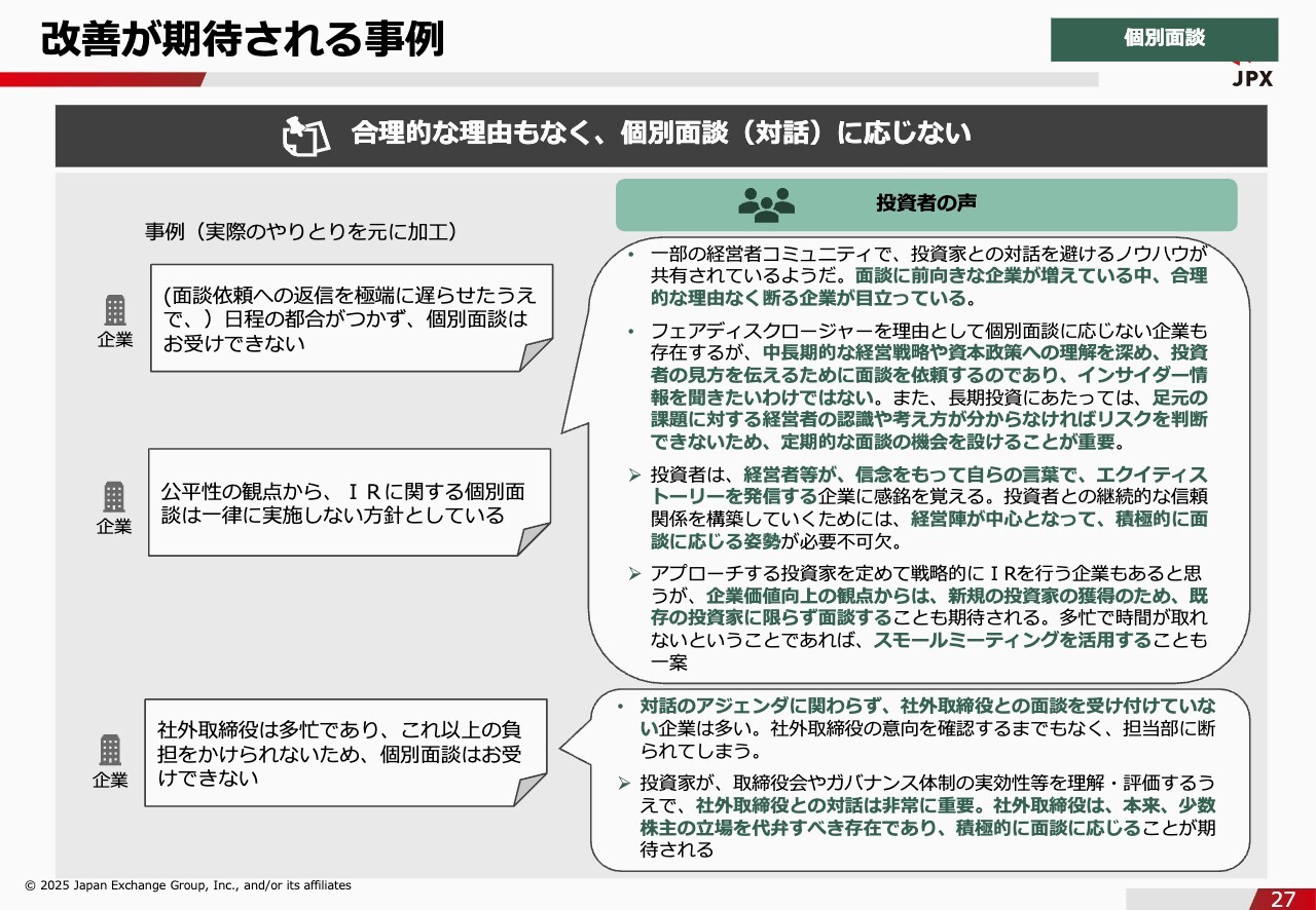 石川:続いて、改善が期待される事例の2つ目です。合理的な理由もなく、個別面談に応じないというケースです。よくあるケースについて、実際のやり取りを紹介しています。投資家から面談依頼が届いても極力返信をせず、最後になって「日程の都合がつかないので面談をお受けできません」というような返信をされたという事例です。また、「公平性の観点から、IRに関する個別面談は一律に実施していません」といった事例もあり、投資家から不満の声が届いている状況です。IRへの注目が高まっていく中で、このような会社に対する不満の声は、本当に日に日に増えてきています。