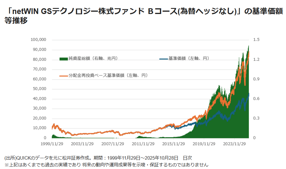 1999年11月に設定された「netWIN GSテクノロジー株式ファンド」シリーズ(ゴールドマン・サックス・アセット・マネジメント)は、スタートだけをみれば、その典型例ともいえるかもしれない。設定直後にITバブル崩壊という憂き目に遭ったことで、基準価額は2000年3月27日の1万4621円から、2002年10月10日の2850円まで最大で80%超も下落した。
