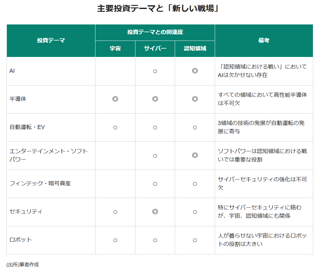 現代の防衛はこうした新しい戦場に対する攻撃も視野に入れた「ハイブリッド戦争」を想定しなければならない。そして、新しい戦場は、技術の軍民共用(デュアルユース)や民間技術の積極活用が不可欠な分野と言ってよいだろう。であれば、この3つの新しい戦場に絡む技術や分野が重要な投資テーマになるのではないか。なぜなら、国策の恩恵に与ることで技術力を高め、新しいイノベーションを生み出すことにもつながるためだ。