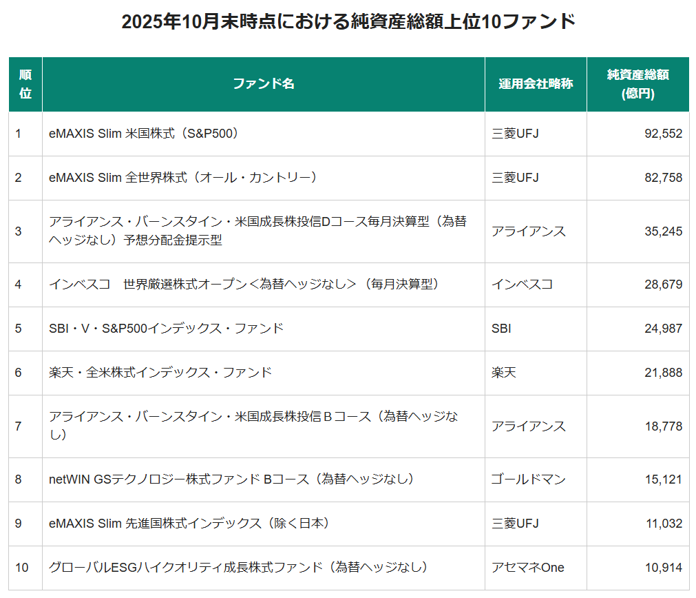 実際に投信トレンドの変化にそうした意識の変化は表れている。投資信託の純資産総額上位を、騒動が起きた2019年の年末と、2025年10月末で比べてみると、顔触れは全く異なる。2019年末時点では上位6本が毎月分配型で、インデックス型はゼロ。今年10月末時点をみると、一部、投資家の支持を集める毎月分配型もランクインするものの、上位10本中5本が株式のインデックス型ファンドだ。