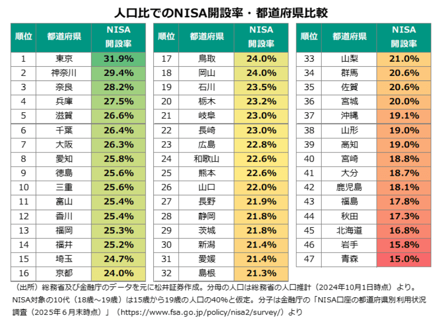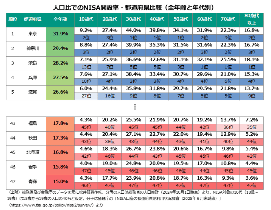 高齢化の影響はどうだろう。確かに長期の資産形成に主眼が置かれたNISA制度に対し、高齢者はあまり積極的ではないとはいえるだろう。高齢化が全体のNISA開設率を下げているという仮説は十分成り立つ。しかし、北海道の場合、年代別にみると、10~30代の若い人たちの開設率も他都府県に比べると低い。もちろん、高齢化も全体の開設率が低い原因の1つとはいえるが、他にも理由はありそうだ。