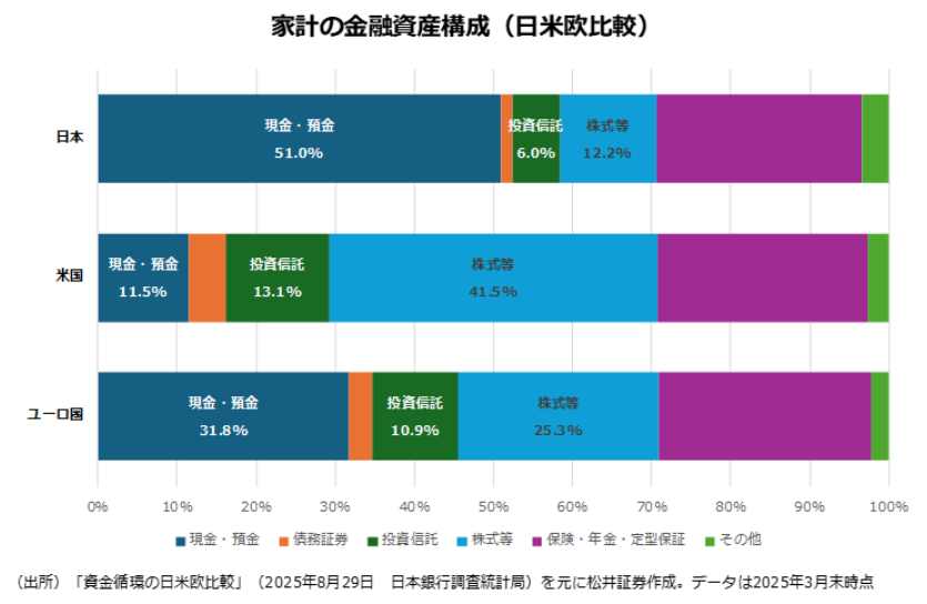 海外の状況にも目を向けてみよう。例えば、以下のような棒グラフは、日本人の金融資産における現預金比率の高さを示す際に使われることが多い。こうみると、米国と欧州の違いも結構浮き彫りになるわけだが、「ユーロ圏」と一括りにすることも、実はあまり適切ではないかもしれない。例えば、欧州一の経済大国であり、GDP(国内総生産)で日本を抜いたドイツは比較的貯蓄志向が強いと言われる。ドイツ連邦銀行のデータによれば、ドイツ家計の現預金比率は40%近くで推移しており、他のユーロ圏諸国や英国、北欧諸国などよりも高い。