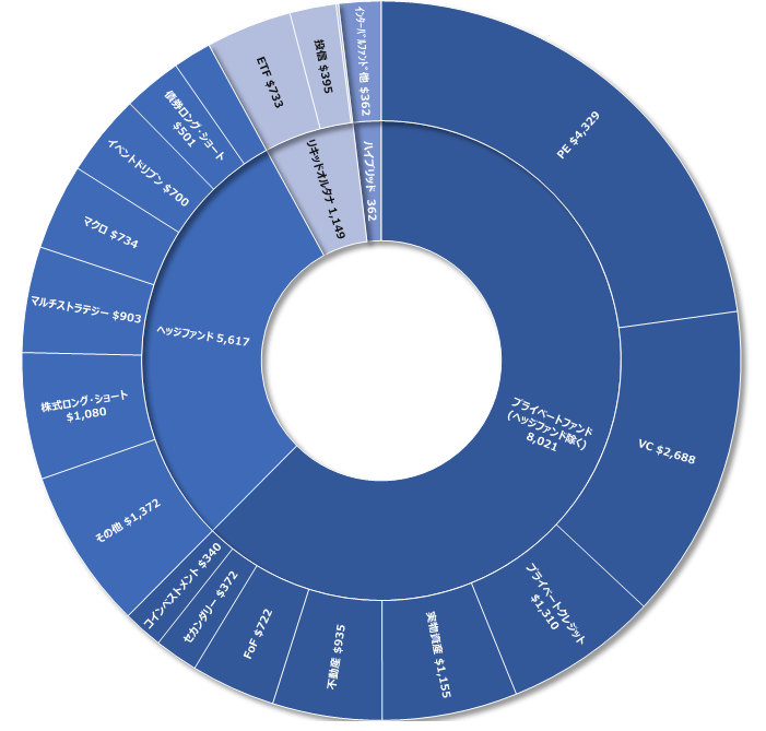 1つ目の棒グラフはオルタナ資産の残高推移で、次の円グラフは2024年末時点の残高の内訳です。プライベートファンド(プライベートエクイティや不動産など)とヘッジファンド、リキッドオルタナ、さらにインターバルファンド・BDCに大別されますが、推移のグラフをご覧いただくと、過去10年間でヘッジファンドやリキッドオルタナが緩やかな増加にとどまるのに対し、ヘッジファンドを除くプライベートファンドが大きく伸びています。また比率こそ小さいもののインターバルファンド・BDC等の残高もこの数年で拡大しています。3つ目のグラフはこれらだけを抜き出したものですが、マーケットがほぼなかったような頃から、広範な富裕層がオルタナ投資の「器(うつわ)」として急速に使うようになったことを反映し急増しています。